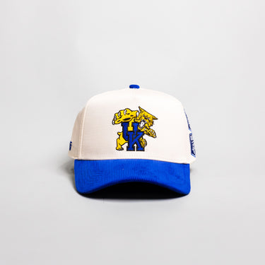 This A-frame snapback pairs a cream cotton crown with a vibrant royal blue corduroy brim, featuring an embroidered Kentucky Wildcat logo on the front and a custom championship banners side patch. Finished with a blue rope detail on top and a snapback closure for adjustable fit.