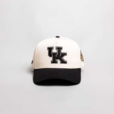 This A-frame snapback pairs a cream cotton crown with a black curved brim, featuring an embroidered "UK" logo on the front and a custom gold "Wildcats" side patch. Finished with signature "Grail" script embroidered on the black undervisor and a snapback closure for adjustable fit.