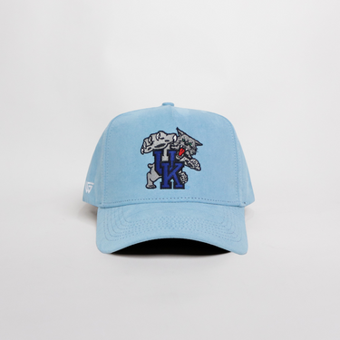 This A-frame snapback features a powder blue suede crown and matching suede curved brim, with an embroidered Kentucky Wildcat logo front and center. Clean, tonal construction with a snapback closure for adjustable comfort.
