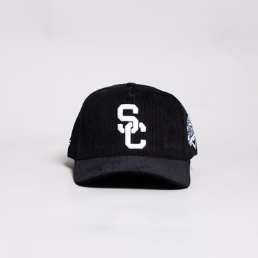 This A-frame snapback is built entirely from black corduroy, giving it a clean, monochrome look with elevated texture. The front features the USC interlock logo embroidered in white, paired with a custom Trojans side patch and tonal detailing throughout.