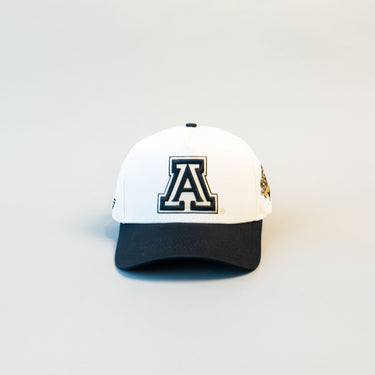 This A-frame snapback features a white cotton crown with the Arizona block “A” up front and a black brim. Finished with a side patch honoring the university and a black snapback closure.