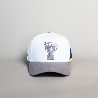 This A-frame snapback features a white cotton crown with the Beetdigger “Y” logo up front and a grey suede brim. Detailed with a stadium side patch and snapback closure in the back.