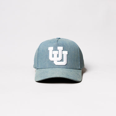 This A-frame snapback features a light blue denim crown with a white "UU" logo embroidered on the front and a matching denim curved brim. Finished with "UTES" embroidery on the back and subtle "Grail" script on the undervisor, plus a snapback closure for adjustable fit.