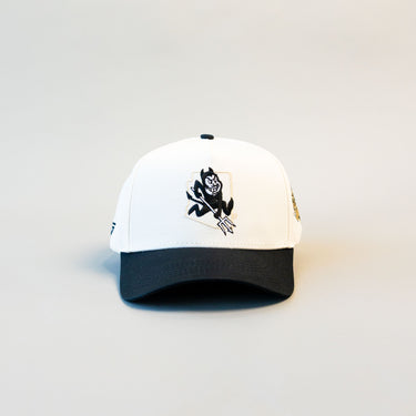 This A-frame snapback features a white cotton crown with the Arizona State pitchfork logo embroidered up front and a black brim. Finished with a Sun Devil side patch and adjustable snapback closure.