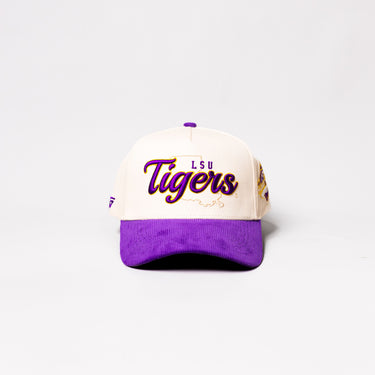 This A-frame snapback celebrates LSU tradition with a cream cotton crown featuring bold "Tigers" script embroidery in purple and gold, paired with a rich purple corduroy curved brim. Elevated with custom Tiger Stadium illustration on the side panel, tonal "LSU" lettering, and a unique spoke-pattern undervisor with "Death Valley" detailing, this hat transforms iconic Baton Rouge landmarks into premium wearable art.
