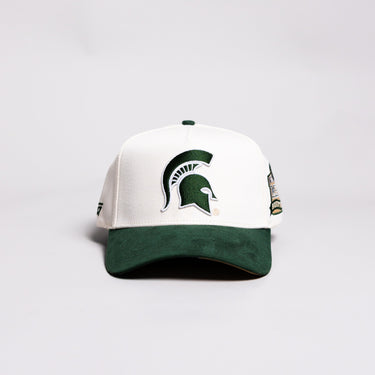 This A-frame snapback features a white cotton crown with a forest green suede brim for a clean courtside look. The front showcases the Spartan logo embroidery, with a custom Michigan State basketball court graphic printed under the brim and a trophy side patch for added detail.
