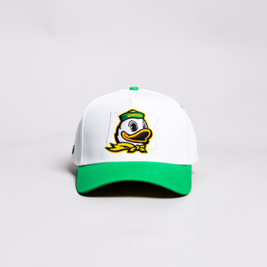This A-frame snapback features a white cotton crown with the classic Oregon Duck mascot embroidered up front. The green curved brim adds contrast, and the hat is finished with a snapback closure for a comfortable, everyday fit.