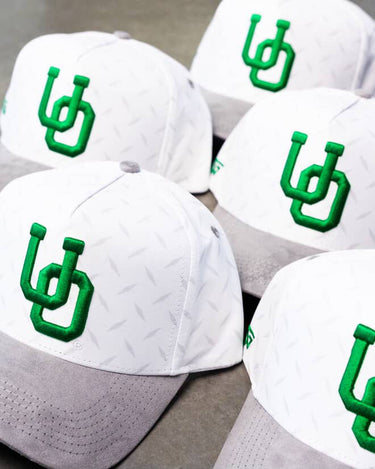 This A-frame snapback features a white crown with a subtle diamond-plate pattern and Oregon’s green interlocking “UO” logo embroidered up front. Finished with a grey brim and a snapback closure built for everyday wear.