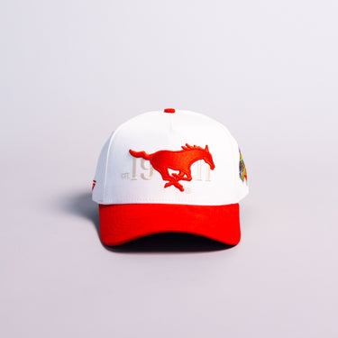 This A-frame snapback features a cream crown with the SMU Mustang logo and “1911” embroidery up front, paired with a red brim. Finished with a custom side patch and a snapback closure in the back.