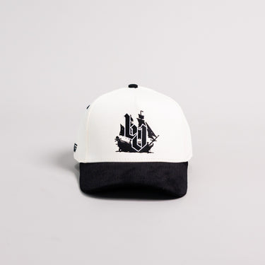 This unstructured 5-panel snapback combines a cream cotton twill crown with a black corduroy brim, featuring an embroidered pirate ship design built for fans of the Silver & Black.