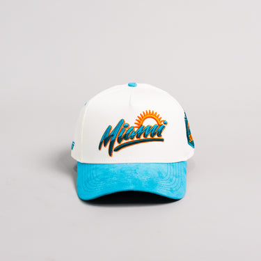 This white-and-teal snapback captures the city’s vibrant energy with bold “Miami” embroidery across the front, accented by a rising sun for a tropical vibe. A teal suede brim adds a premium touch, while the custom “305” patch on the side highlights the city’s iconic area code with palm trees, skyline, and ocean details—perfect for repping the Magic City in style.