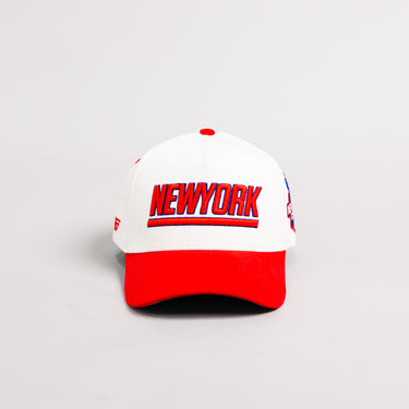 A structured white and red performance hat with bold “NEW YORK” front embroidery and Statue of Liberty patch on the side. Built from lightweight tech fabric with a curved brim.