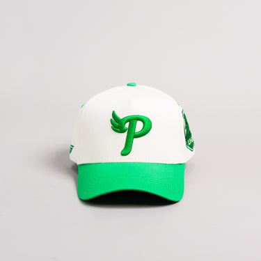 A structured 100% cotton hat with a cream crown and bright green brim, featuring the winged “P” and Liberty Bell side patch.