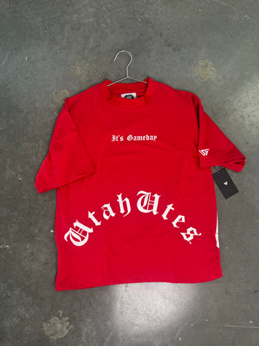 Front features arched Utah Utes text with “It’s Gameday” at the chest. Back graphic highlights the stadium with oversized emblem detail.